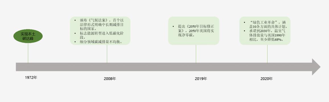 報(bào)告圍繞中國應(yīng)對氣候變化的政策措施、歐美日主要國家的典型做法、中國“碳達(dá)峰、碳中和”現(xiàn)狀及實(shí)施路徑等方面進(jìn)行深度分析,重點(diǎn)在電力行業(yè)、工業(yè)行業(yè)、交通運(yùn)輸行業(yè)、建筑行業(yè)展開專題研究,共同探討各地方政府實(shí)現(xiàn)“雙碳”目標(biāo)的行動(dòng)方案,以期為地方政府決策及業(yè)界參考提供智力支撐,助力我國“碳達(dá)峰、碳中和”目標(biāo)的實(shí)現(xiàn)。 1.碳達(dá)峰發(fā)展階段 在應(yīng)對全球氣候變化、實(shí)現(xiàn)碳中和目標(biāo)上,英國通過一系列的承諾和改革舉措,在該領(lǐng)域保持世界領(lǐng)先地位。 英國早在1972年就已經(jīng)實(shí)現(xiàn)本土碳達(dá)峰,2008年正式頒布《氣候變化法》,確定了到2050年將溫室氣體排放量比1990年減少80%的長期減排目標(biāo),成為世界上首個(gè)以法律形式明確中長期減排目標(biāo)的國家。在法案通過后的10年間,英國溫室氣體減排初具成效,2018年比2008年下降了30%。 2019年6月,英國提出了《2050年目標(biāo)修正案》,正式確立到2050年實(shí)現(xiàn)溫室氣體“凈零排放”。 2020年11月宣布一項(xiàng)涵蓋10個(gè)方面的“綠色工業(yè)革命”計(jì)劃,包括大力發(fā)展海上風(fēng)能、推進(jìn)新一代核能研發(fā)和加速推廣電動(dòng)車等。 2020年12月宣布最新減排目標(biāo),承諾到2030年英國溫室氣體排放量與1990年相比,至少降低68%。