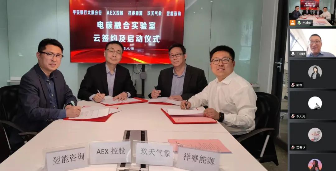 4月18日,祥睿能源與平安銀行、AEX控股、玖天氣象、翌能咨詢舉行了“電碳融合實(shí)驗(yàn)室”線上云簽約暨啟動(dòng)儀式。平安銀行太原分行行長(zhǎng)王曉剛、AEX控股有限公司總經(jīng)理黃杰夫、北京玖天氣象科技有限公司總經(jīng)理黃俊、翌能(北京)咨詢有限公司總經(jīng)理鄭鵬程、山西祥睿能源有限公司董事長(zhǎng)王正通等出席。