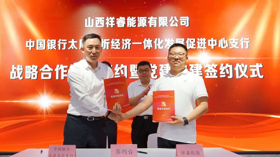 5月31日上午,中國銀行山西省分行太忻支行與祥睿能源舉行戰(zhàn)略合作協(xié)議簽約暨黨建共建簽約儀式。山西省委統(tǒng)戰(zhàn)部副部長郭延斌,中國銀行山西省分行黨委委員、副行長王智勇,太忻支行支部書記、行長安興華等蒞臨現(xiàn)場,祥睿能源董事長王正通,總裁楊新宇,山西復興能源研究院名譽院長白祚祥,黨支部專職副書記武忠民等出席簽約儀式。