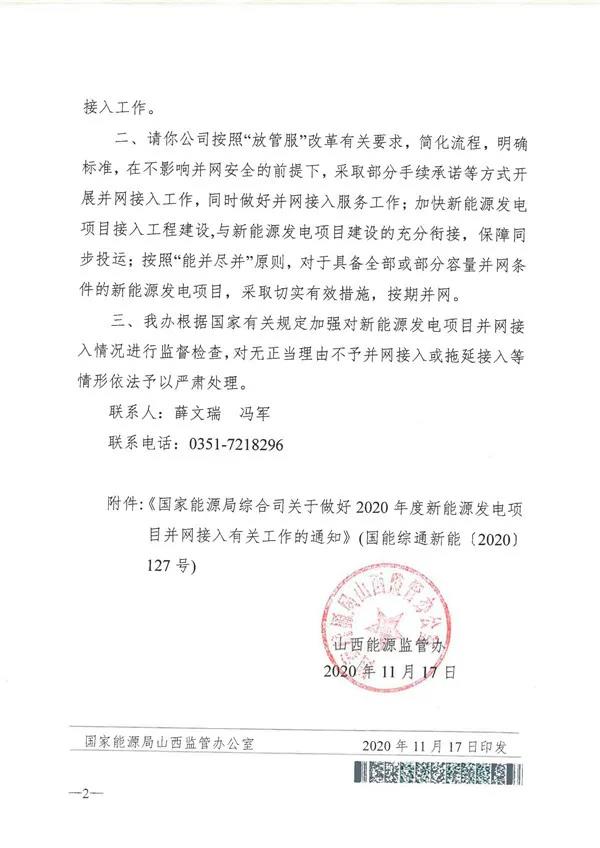 11月19日,山西能源監(jiān)管辦印發(fā)《山西能源監(jiān)管辦關(guān)于做好2020年度新能源發(fā)電項(xiàng)目并網(wǎng)接入有關(guān)工作的通知》,要求電網(wǎng)企業(yè)簡化工作流程,明確接入標(biāo)準(zhǔn),按照“能并盡并”原則,對于具備全部或部分容量并網(wǎng)條件的新能源發(fā)電項(xiàng)目,采取切實(shí)有效措施,全力統(tǒng)籌做好新能源發(fā)電項(xiàng)目并網(wǎng)接入工作,確保按期并網(wǎng)。 下一步,山西能源監(jiān)管辦將進(jìn)一步加強(qiáng)新能源發(fā)電項(xiàng)目并網(wǎng)接入情況進(jìn)行監(jiān)督檢查,對無正當(dāng)理由不予并網(wǎng)接入或拖延接入等情形依法予以嚴(yán)肅處理。 文件全文如下: |