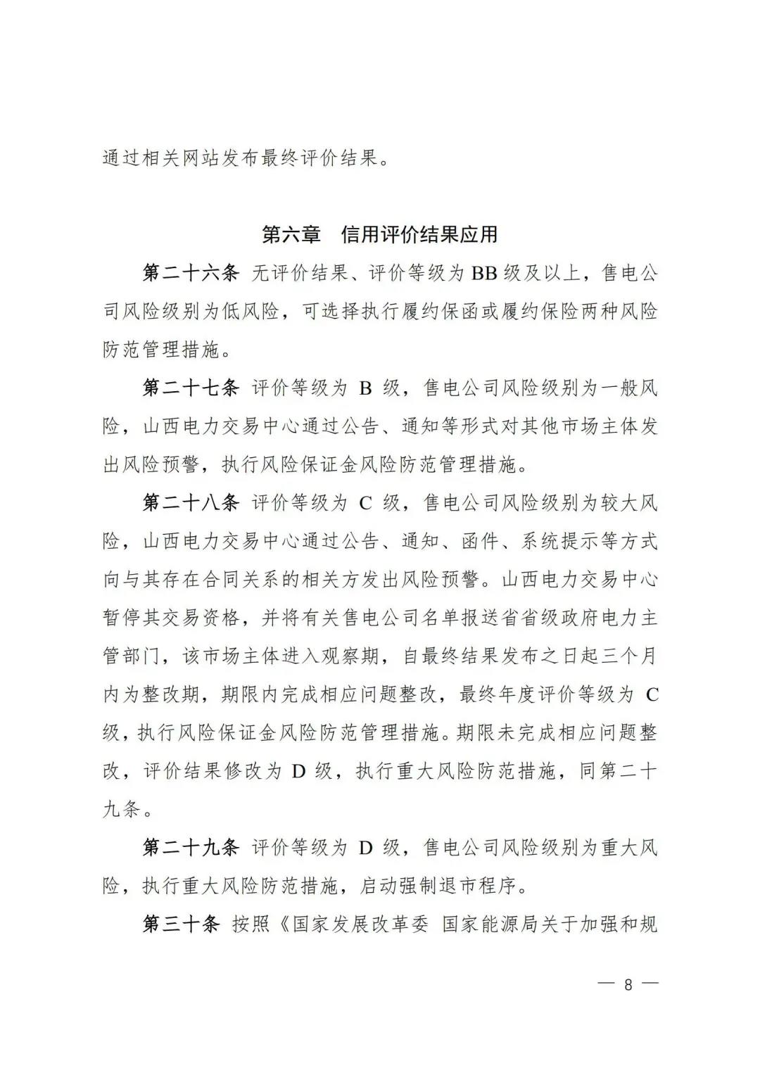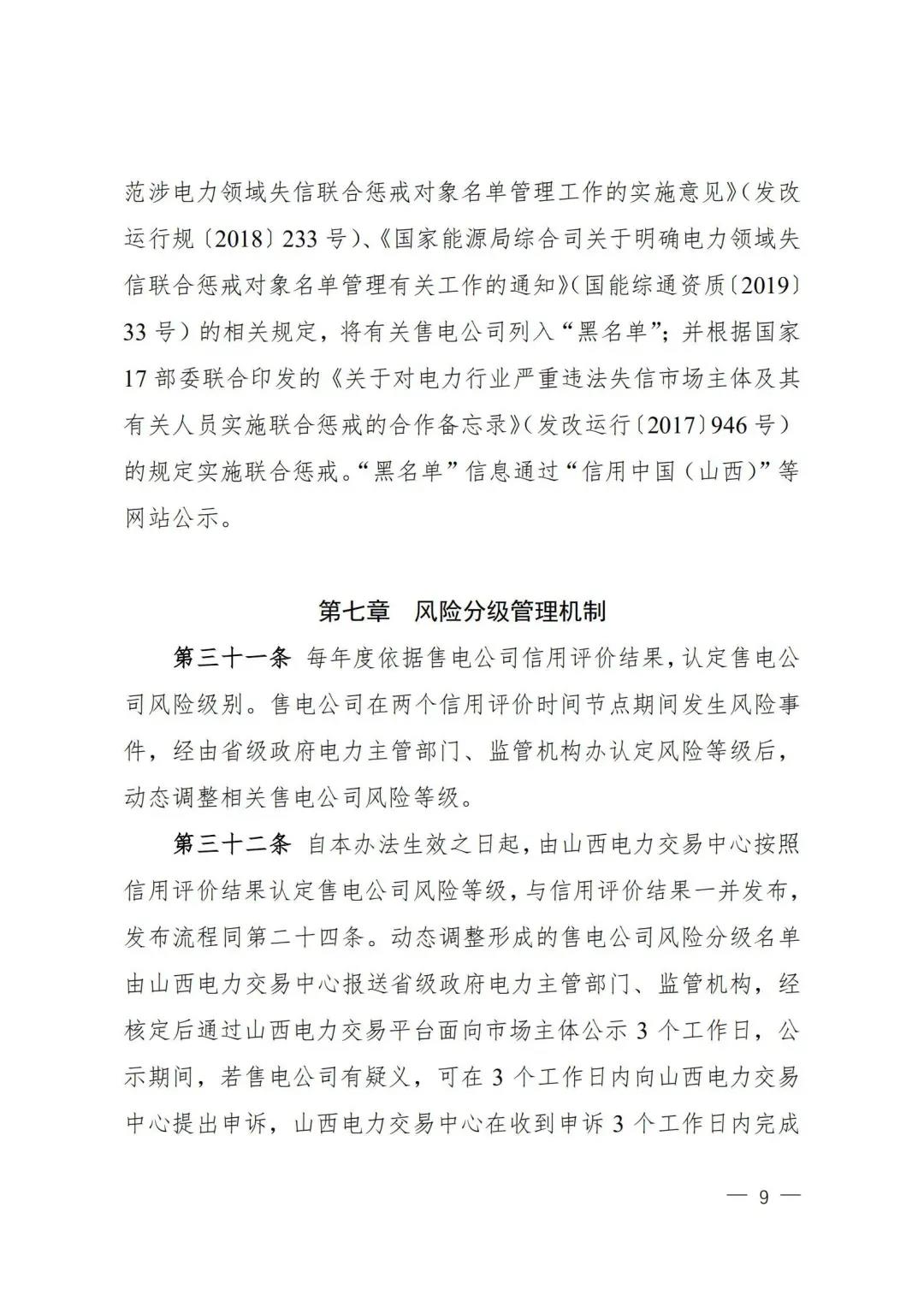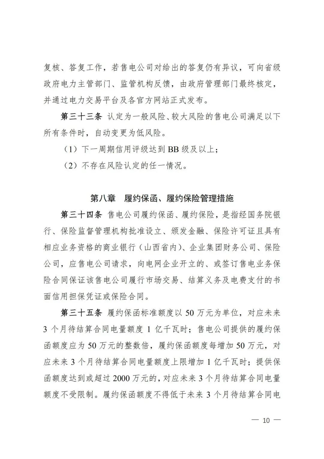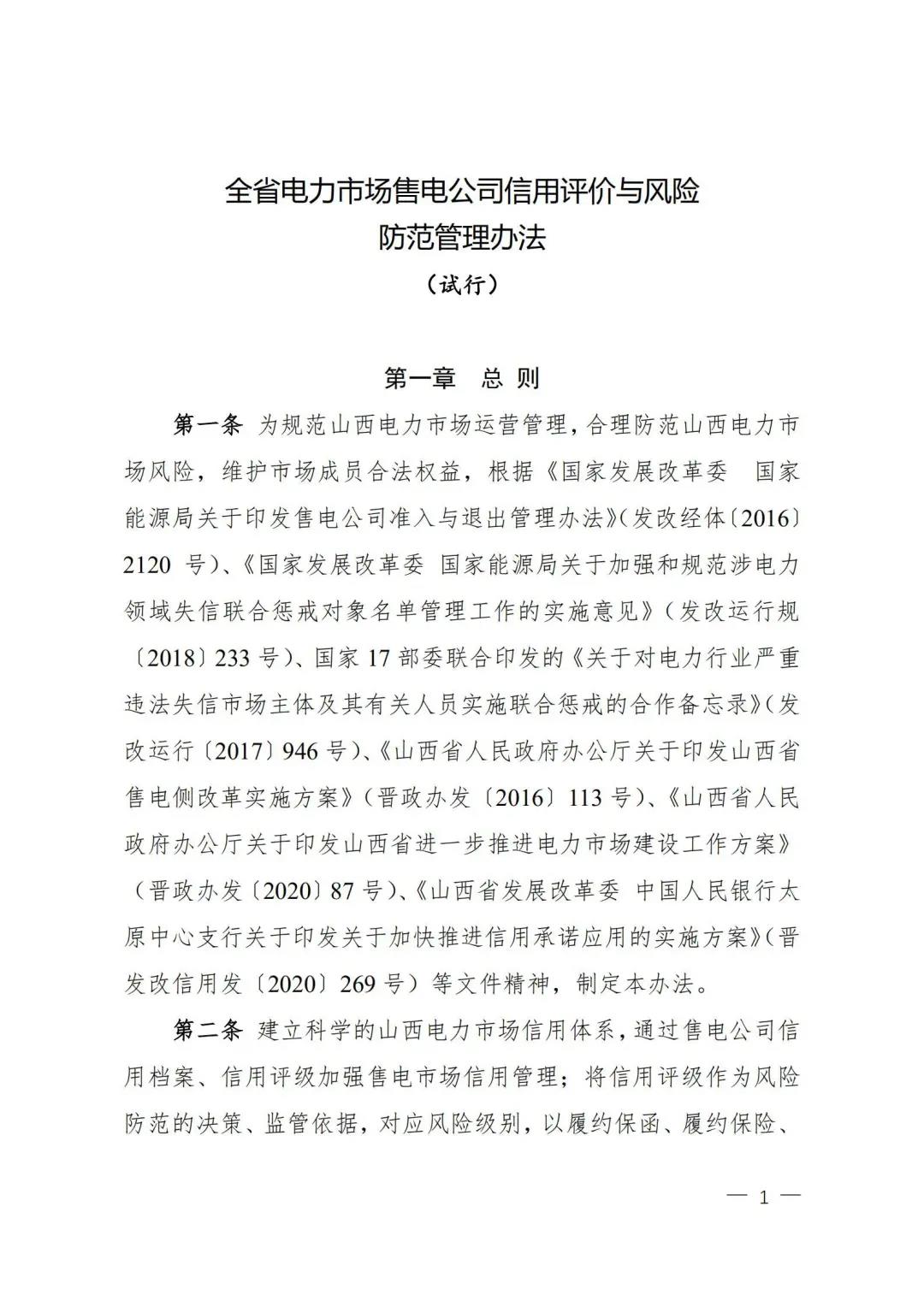 | 山西電力市場售電公司信用評價與風(fēng)險防范管理辦法:依據(jù)風(fēng)險級別執(zhí)行履約保函、保險或風(fēng)險保證金措施 |